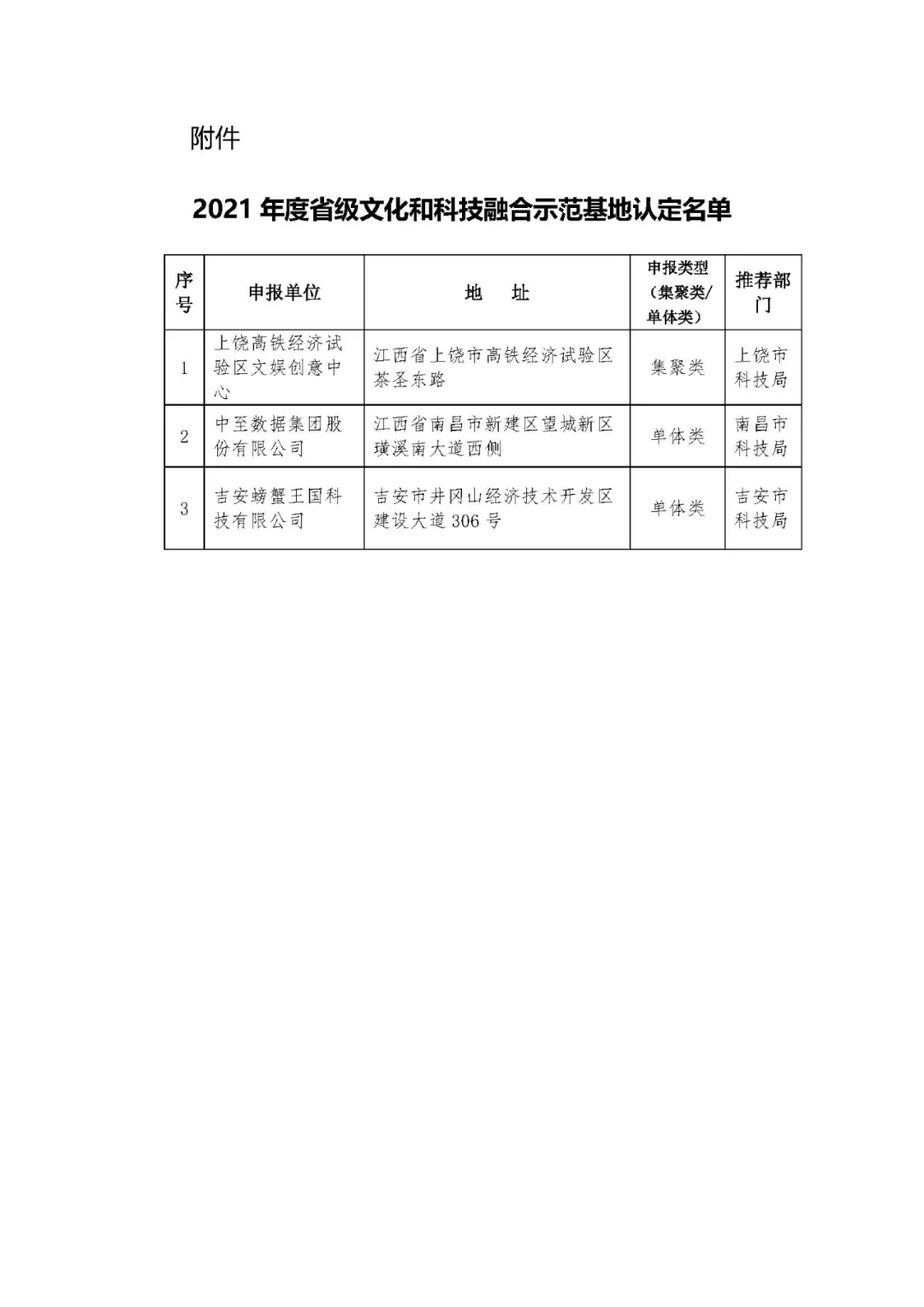 按照《关于推进文化和科技深度融合发展的实施意见》(赣科发高字〔2020〕54号)和《江西省文化和科技融合示范基地认定管理办法(试行)》(赣科发高字〔2021〕1号)要求,省科技厅、省委宣传部、省委网信办、省文化和旅游厅、省广播电视局,联合开展了省级文化和科技融合示范基地(以下简称基地)的认定申报工作。经合规性审核、专家评审、现场考察、部门商议、公示等环节,决定认定上饶高铁经济试验区文娱创意中心1家集聚类,中至数据集团股份有限公司、吉安螃蟹王国科技有限公司2家单体类为省级文化和科技融合示范基地(名单见附件)。