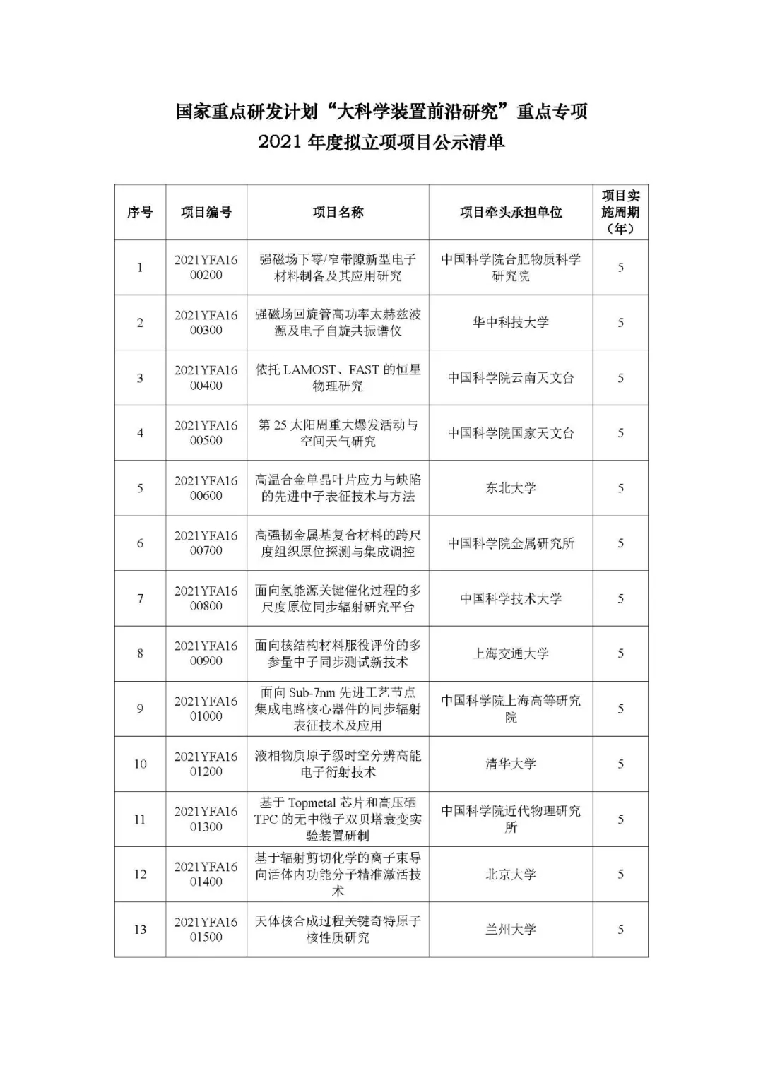 根据《国务院关于改进加强中央财政科研项目和资金管理的若干意见》(国发〔2014〕11号)《国务院关于深化中央财政科技计划(专项、基金等)管理改革方案的通知》(国发〔2014〕64号)《财政部 科技部关于印发<国家重点研发计划资金管理办法>的通知》(财教〔2021〕178号)等文件要求,现对“大科学装置前沿研究”重点专项2021年度拟立项项目信息进行公示。